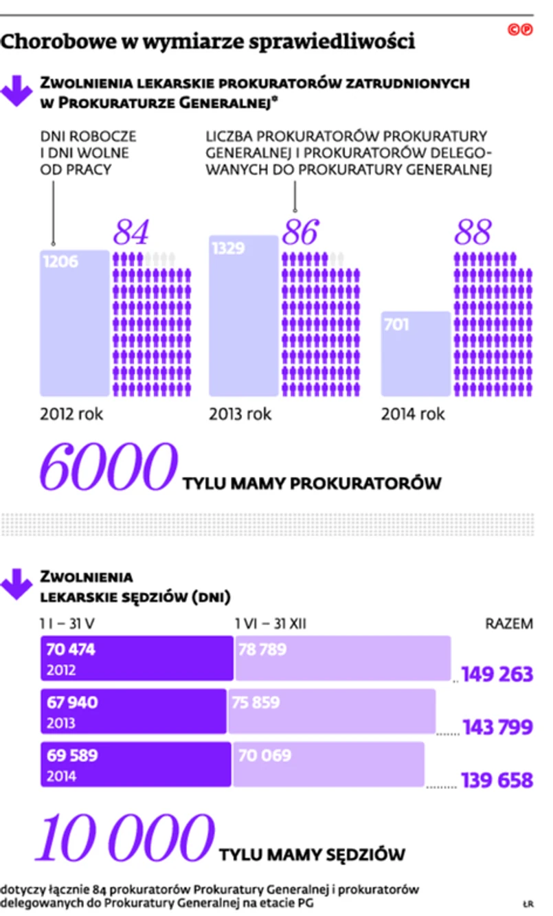 Chodzi o nowelizację ustawy o prokuraturze, prawa o ustroju sądów powszechnych oraz ustawy o Sądzie Najwyższym (Dz.U. z 2014 r. poz. 504), zgodnie z którą od czerwca 2014 r. za pójście na zwolnienie lekarskie sędziowie i prokuratorzy – tak jak wszyscy inni pracujący – dostają już nie 100, lecz 80 proc.