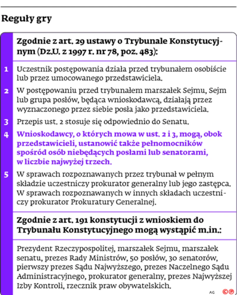 prawo ustanowienia pełnomocnika (obok przedstawicieli) zostało ograniczone jedynie do przypadków enumeratywnie wymienionych: marszałka Sejmu, Senatu, grupy posłów i senatorów, a także dla skarżącego (art. 29 ust. 1 i 4 i art. 24 ust. 3).