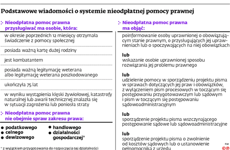 radców prawnych porozumienie w sprawie świadczenia nieodpłatnej pomocy na swoim obszarze. W dokumencie znaleźć się ma m.in. liczba adwokatów i radców, którzy takiej pomocy będą udzielać, oraz zasady ich wynagradzania. W ustępie drugim wskazano jednak, że w przypadku niezawarcia porozumienia (do 30 listopada każdego roku) starosta przekaże dziekanom informacje o lokalizacji punktów nieopłatnej pomocy prawnej oraz harmonogram dni i godzin, w których winna być udzielana. Na podstawie tych danych dziekani wyznaczą adwokatów lub radców, którzy zobowiązani będą świadczyć w punktach swoje usługi. Jak czytamy w uzasadnieniu projektu, „zaproponowane rozwiązanie jest akceptowane zarówno przez samorząd radcowski, jak i samorząd adwokacki (...) i odwołuje się do pozytywnych doświadczeń bazujących na istniejącym systemie wyznaczania pełnomocników z urzędu w postępowaniu cywilnym”.