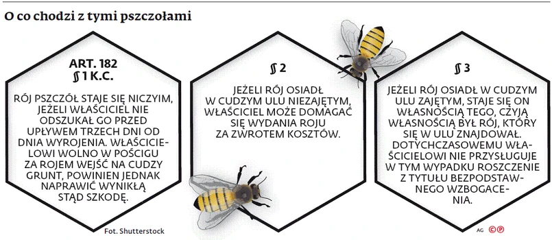 prawa, analizując jego zapisy, wpadał w osłupienie, gdy przyszło mu czytać art. 182 k.c., do którego zapewne już nigdy nie wrócił jako świadczący pomoc prawną profesjonalista. Zawarta w nim została swego rodzaju instrukcja, co może zrobić pszczelarz, gdy jego owady postanowią opuścić macierzysty ul (może się udać w pogoń za nimi, wchodząc na inne posesje) i czyje pszczoły się stają, jeśli właściciel w porę ich nie odszuka. Niestety, ustawodawca nie dał mu wiele czasu na poszukiwania: „rój pszczół staje się niczyim, jeżeli właściciel nie odszukał go przed upływem trzech dni od dnia wyrojenia”.