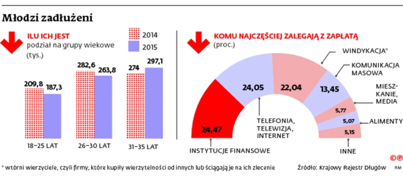 W bazie Krajowego Rejestru Długów widnieje obecnie ponad 748 tys. dłużników, którzy nie ukończyli jeszcze 35. roku życia. Dobra informacja jest taka, że liczba młodych dłużników w ciągu ostatniego roku spadła o ponad 18 tys. Zła, że ich łączne zaległości wzrosły o ponad 2 mln zł. Takich dobrych i złych informacji w raporcie KRD jest więcej. Na przykład dobrze wygląda duży spadek liczby najmłodszych dłużników, w wieku 18–25 lat. Jeszcze rok temu było ich około 210 tys., teraz jest 187,3 tys. A i średni dług najmłodszych jest grubo poniżej średniej, wynosi 2360 zł (średnia to 5301 zł).