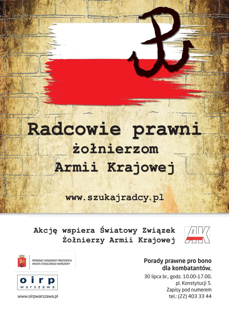 Porady prawne w ramach tej inicjatywy będą udzielane 30 lipca, w godz. 10.00-17.00 w siedzibie OIRP w Warszawie przy pl. Konstytucji 5, ewentualnie podczas kolejnych dyżurów w przypadku dużej liczby chętnych.