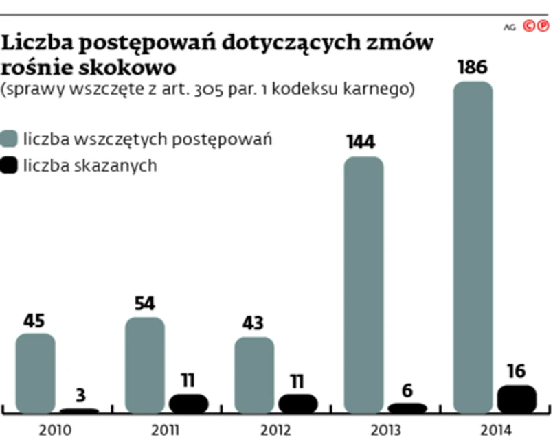 Statystyka potwierdza problemy z doprowadzaniem do sądowego finału spraw dotyczących zmów. Chociaż liczba wszczynanych postępowań rośnie skokowo, to nie znajduje to odzwierciedlenia w liczbie wyroków skazujących. W ubiegłym roku wszczęto prawie cztery razy więcej spraw niż w 2012 r., bo aż 186. Wyroków skazujących zapadło natomiast jedynie 16, podczas gdy w 2012 r. było ich 11.
