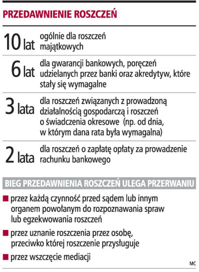Zgodnie z kodeksem cywilnym, zdecydowana większość roszczeń majątkowych ulega przedawnieniu po upływie określonych terminów. Co do zasady jest to dziesięć lat, a dla roszczeń o świadczenia okresowe lub roszczeń związanych z prowadzeniem działalności gospodarczej trzy lata.