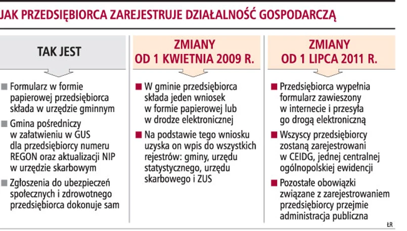Tylko do 31 marca 2009 r. przedsiębiorcy mają rejestrować rozpoczęcie działalności w ewidencji działalności w gminach. Od 1 kwietnia 2009 r. do 30 czerwca 2011 r. będzie możliwa rejestracja w formie papierowej lub elektronicznej. Po 1 lipca 2011 r. przedsiębiorca zarejestruje się tylko w formie elektronicznej w ogólnopolskiej ewidencji w CEIDG.