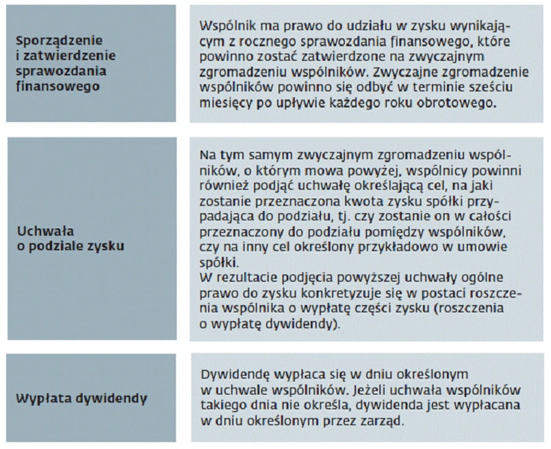 Prawo do zysku wypracowanego przez spółkę jest jednym z podstawowych praw korporacyjnych wspólnika. Umożliwia ono wspólnikowi osiąganie przychodów z prowadzonej przez spółkę działalności. Zanim jednak dojdzie do wypłaty dywidendy na rzecz wspólników, powinny zostać spełnione ustawowe wymogi określone w ustawie z 15 września 2000 r. – Kodeks spółek handlowych (t.j. Dz.U. z 2013 r. poz. 1030 ze zm.; dalej: k.s.h.). Umowa spółki może modyfikować poniższe reguły w określonym przez ustawę zakresie.