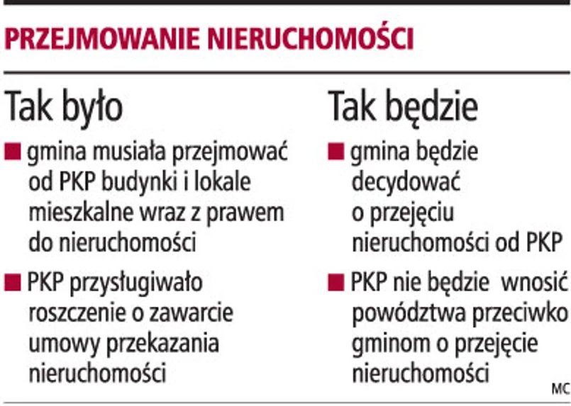Nie można zmuszać gminy do nieodpłatnego przejęcia od Polskich Kolei Państwowych zadłużonych oraz wymagających remontu nieruchomości. Taki wniosek płynie z wczorajszego wyroku Trybunału Konstytucyjnego, który uznał za niezgodny z konstytucją art. 81 ust. 5 ustawy o komercjalizacji, restrukturyzacji i prywatyzacji przedsiębiorstwa państwowego Polskie Koleje Państwowe w zakresie, w jakim pozbawia gminę możliwości odmowy zawarcia umowy przekazania nieruchomości.