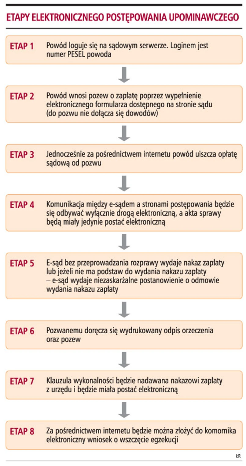 Elektroniczne postępowanie upominawcze wejdzie w życie 1 stycznia 2010 r. Termin ten został określony w projekcie nowelizacji kodeksu postępowania cywilnego. Wzorem dla polskiego sądu elektronicznego był system brytyjski (Money Claim On line).