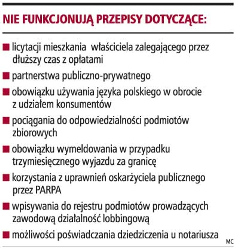 Nadal obowiązuje wiele ustaw, które w całości lub w części pozostają martwą literą prawa. Nie są bowiem w praktyce możliwe do stosowania lub nieprzestrzeganie ich przepisów wynika z powodu braku odpowiednich sankcji. I tak np. obowiązująca od przeszło dwóch lat ustawa o działalności lobbingowej w procesie stanowienia prawa nie przyniosła oczekiwanych skutków. Z kolei na podstawie obowiązującej od 2002 roku ustawy o odpowiedzialności podmiotów zbiorowych rozpoznano tylko 24 sprawy. Przykładów niestosowanych przepisów jest w naszym prawie więcej.