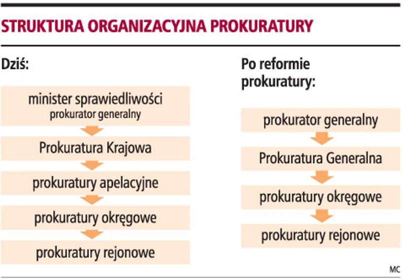 Zakłada się też zmianę struktury organizacyjnej prokuratury. Zlikwidowana ma zostać Prokuratura Krajowa oraz prokuratury apelacyjne. Pozostawione będą prokuratury rejonowe i okręgowe, zostanie stworzona Prokuratura Generalna.