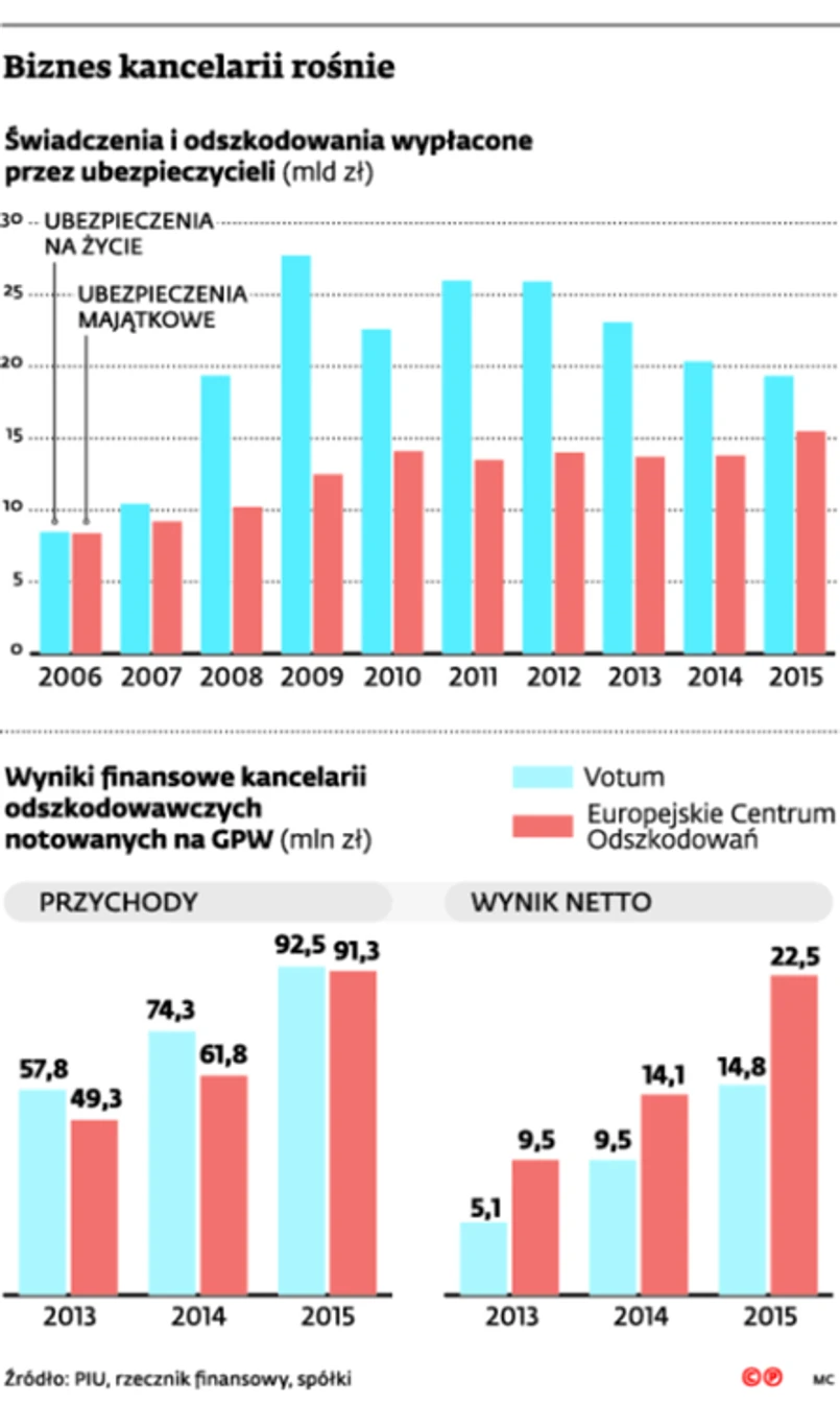Z szacunków rzecznika finansowego wynika, że w 2015 r. przez rachunki kancelarii odszkodowawczych – firm, które dochodzą roszczeń w imieniu klientów, zwykle pobierając za to część przyznanych świadczeń – przepłynęło 1,5 mld zł. To biznes, który w Polsce rozwija się od dekady i w dynamicznie rośnie. Dowodzą tego wyniki dwóch największych takich firm w kraju: Votum i Europejskiego Centrum Odszkodowań (EuCO). Przychody pierwszej wzrosły w ostatnich trzech latach o 60 proc., a zysk netto o 188 proc. Obroty drugiej wzrosły o 85 proc., a zysk o 136 proc.