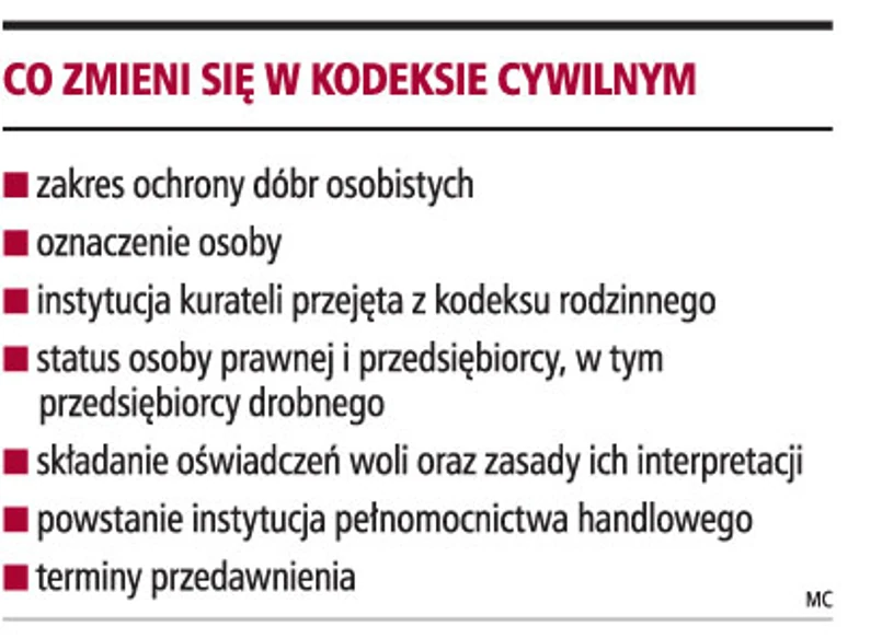 Komisja Kodyfikacyjna Prawa Cywilnego przygotowała zapowiadany od dawna projekt zmian części ogólnej kodeksu cywilnego. Nowości jest dużo. Przede wszystkim uporządkowana zostanie struktura przepisów. Pierwsza księga po zmianach będzie liczyć 180 artykułów (dzisiaj 125). Część ogólna zostanie rozszerzona o nowe instytucje takie jak kuratela, której przepisy obecnie funkcjonują w kodeksie rodzinnym i opiekuńczym. Projekt regulacji zawiera również nowe definicje przedsiębiorcy, rodzajów pełnomocnictwa czy zasad interpretacji oświadczeń woli. Przepisy inaczej określają również termin przedawnienia roszczeń cywilnych. Niektóre propozycje już dzisiaj budzą obawy ekspertów.