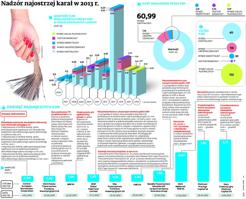 Od powstania w 2006 r. Komisja Nadzoru Finansowego nałożyła na wszystkie nadzorowane podmioty kary o wartości sięgającej niemal 72 mln zł – wynika z podsumowania DGP na podstawie zestawienia wszystkich przypadków naruszeń prawa publikowanego przez Urząd KNF. Liczba nałożonych kar finansowych zbliża się do 1,1 tys. Liczbowo najwięcej nałożono ich w segmencie usług płatniczych, gdzie nadzór w ostatnich dwóch latach odnotował i ukarał ponad pół tysiąca przypadków naruszenia prawa poprzez nieprzekazanie KNF w ustawowym terminie informacji o łącznej wartości i liczbie transakcji płatniczych albo niezłożeniu w ustawowym terminie dokumentu potwierdzającego zawarcie umowy gwarancji albo umowy ubezpieczenia. Pod względem wartości nałożonych sankcji na pierwszym miejscu są podmioty działające na rynku kapitałowym: zarówno firmy inwestycyjne, spółki publiczne oraz osoby związane z tymi spółkami, jak i towarzystwa funduszy inwestycyjnych. Wartość kar w odniesieniu do rynku kapitałowego zbliża się do 61 mln zł.