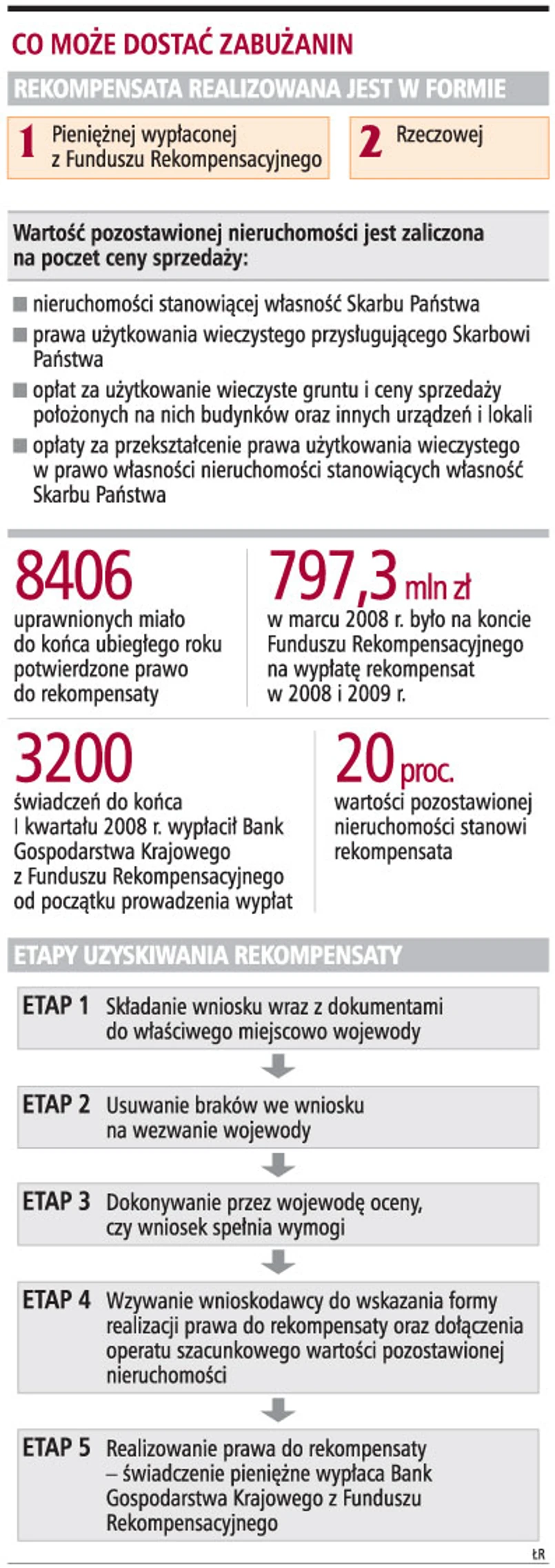 Wnioski o rekompensatę za nieruchomości pozostawione poza granicami składa się do wojewody. O uprawnienie do rekompensaty może wystąpić spadkobierca zabużanina. Zarówno zabużanin, jak i jego spadkobiercy nie mogą sprzedać potwierdzonego prawa do rekompensaty.