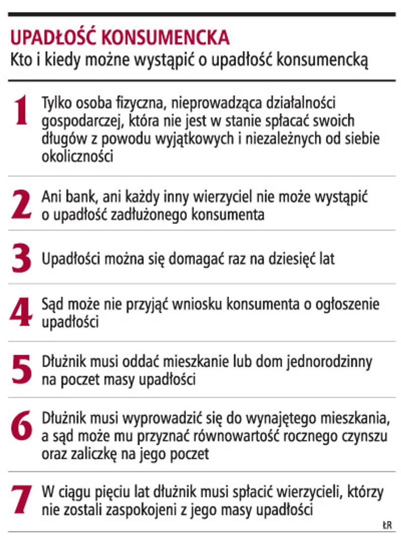 Po wejściu w życie ustawy z 5 grudnia 2008 r. z wnioskiem o upadłość może wystąpić tylko zadłużony konsument i złożyć go do właściwego miejscowo sądu, który zbada, czy może go przyjąć.