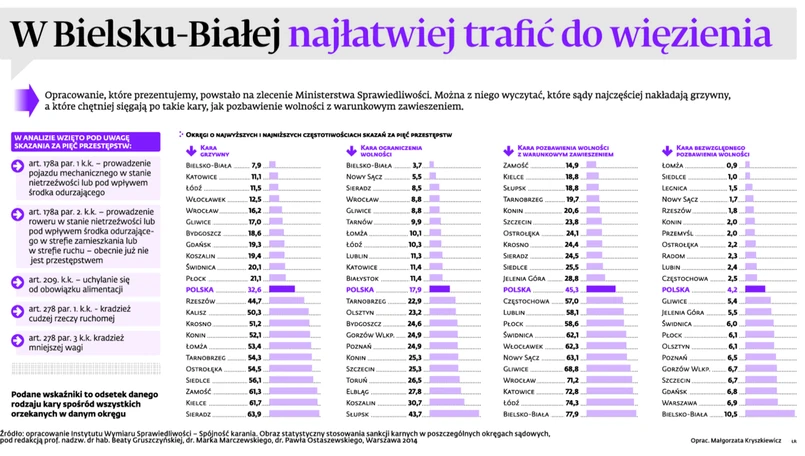 Opracowanie, które prezentujemy powstało na zlecenie Ministra Sprawiedliwości. Można z niego wyczytać, które sądy najczęściej nakładają grzywny, a które chętniej sięgają po takie kary, jak pozbawienie wolności z warunkowym zawieszeniem.