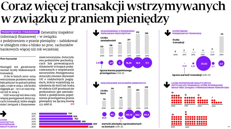 Generalny inspektor informacji finansowej - w związku z podejrzeniem o pranie brudnych pieniędzy - zablokował w ubiegłym roku o blisko 20 proc. rachunków bankowych więcej niż rok wcześniej.