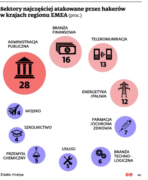 Sektory najczęściej atakowane przez hakerów w krajach regionu EMEA / Dziennik Gazeta Prawna